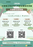 【公告】:「2026台積電生物多樣性獎學金暨提案獎勵計畫」2025-11-13/在: 最新消息 /通過: 林宏勳內容: 「2026台積電生物多樣性獎學金暨提案獎勵計畫」,詳如附件。 附件: 114RD04281 Coa1146520174112657 Di /wp-content/uploads/2023/01/logooneww.png 0 0 林宏勳 /wp-content/uploads/2023/01/logooneww.png 林宏勳2025-11-13 19:18:452025-11-13 19:18:45【公告】:「2026台積電生物多樣性獎學金暨提案獎勵計畫」