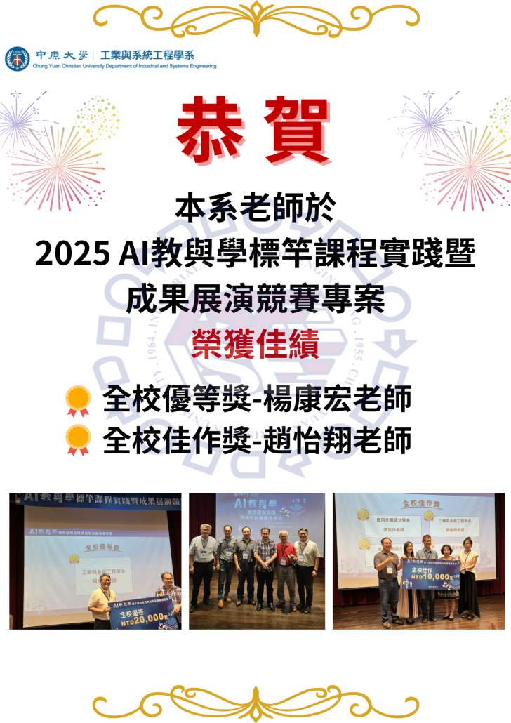 【公告】:恭賀!本系老師於2025AI教與學標竿課程實踐暨成果展演競賽專案榮獲佳績!! 全校優等獎-楊康宏老師 全校佳作獎-趙怡翔老師