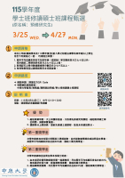 【公告】本校115學年度學士班學生修讀碩士班課程甄選(原名稱:預備研究生)申請作業及說明會事宜2026-03-09/在: 最新消息 /通過: 林宏勳內容: 本校115學年度學士班學生修讀碩士班課程甄選(原名稱:預備研究生)申請作業及說明會事宜,詳如附件。 附件: 115AA00170 附件1 申請注意事項 . 附件2 申請所需文件彙整表 附件3 甄選辦法 附件4 試辦方案 /wp-content/uploads/2023/01/logooneww.png 0 0 林宏勳 /wp-content/uploads/2023/01/logooneww.png 林宏勳2026-03-09 22:15:452026-03-10 19:46:51【公告】本校115學年度學士班學生修讀碩士班課程甄選(原名稱:預備研究生)申請作業及說明會事宜