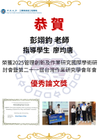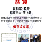 賀! 彭翊鈞 老師 指導學生 廖均唐 榮獲 2025管理創新及作業研究國際學術研討會暨第二十一屆台灣作業研究學會年會 優秀論文獎!!2025-12-11/在: 學系榮譽, 最新消息 /通過: 林宏勳 https://ise.cycu.edu.tw/wp-content/uploads/2025/12/4.png 2000 1414 林宏勳 /wp-content/uploads/2023/01/logooneww.png 林宏勳2025-12-11 18:05:002025-12-11 18:05:00賀! 彭翊鈞 老師 指導學生 廖均唐 榮獲 2025管理創新及作業研究國際學術研討會暨第二十一屆台灣作業研究學會年會 優秀論文獎!!