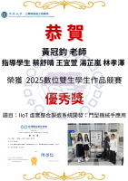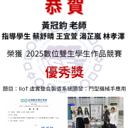 賀! 黃冠鈞 老師 指導學生 蔡舒晴 王宜萱 湯芷嵐 林孝澤 榮獲 2025數位雙生學生作品競賽 優秀獎!!
