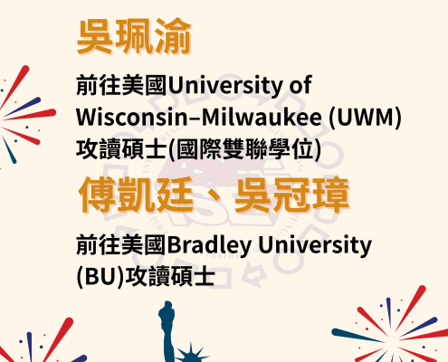 【公告】:恭賀!本系同學赴美深造 吳珮渝同學前往美國University of Wisconsin–Milwaukee (UWM)攻讀碩士(國際雙聯學位) 傅凱廷、吳冠璋同學前往美國Bradley University(BU)攻讀碩士