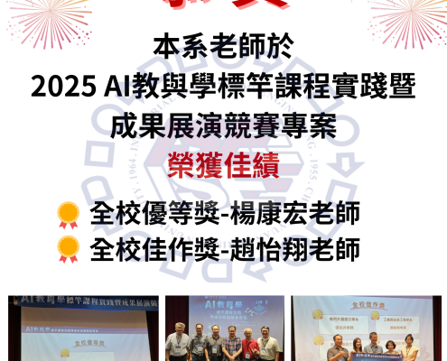 【公告】:恭賀!本系老師於2025AI教與學標竿課程實踐暨成果展演競賽專案榮獲佳績!! 全校優等獎-楊康宏老師 全校佳作獎-趙怡翔老師